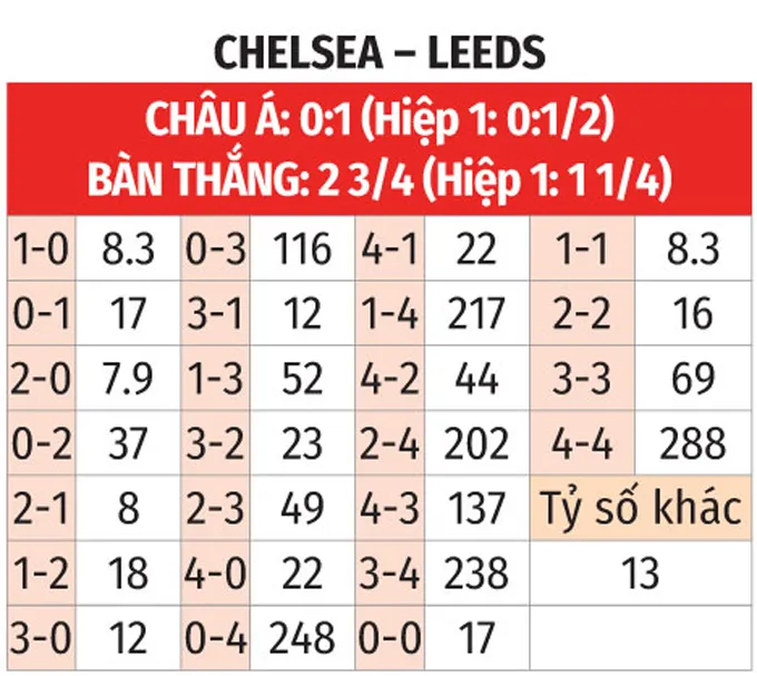 - Tổng số bàn thắng chẵn: Lịch sử đối đầu và phong độ gần đây của Chelsea (6/10 trận) cho thấy khả năng cao tổng số bàn thắng sẽ là một số chẵn.