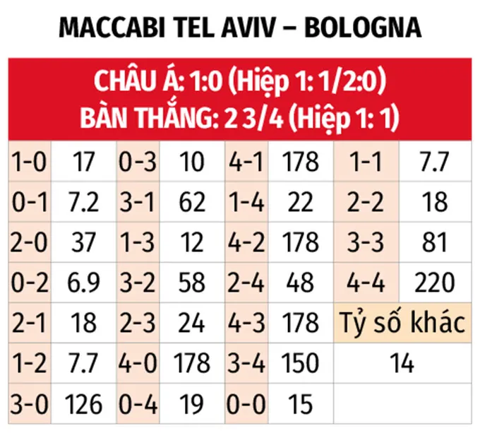 - Tổng bàn thắng lẻ: 4/5 trận gần đây của Maccabi Tel Aviv kết thúc với tổng số bàn thắng là số lẻ. Kịch bản này cũng xuất hiện ở 3/4 trận vừa qua của Bologna.
