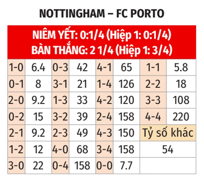 - Bàn thắng sớm ở hiệp 1: Các trận đấu gần đây của cả hai đội thường chứng kiến bàn thắng được ghi sớm. 7/9 trận của Nottingham và 7/8 trận của Porto đều có ít nhất một bàn trong hiệp một.